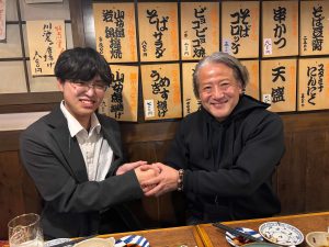 「来年度より入局させていただく山本晴希と申します。愛媛大学出身で愛媛生まれ愛媛育ちと言った経歴ですが、川崎市での初期研修医時代に青木武士教授をはじめとした昭和医科大学の諸先輩方に大変よくしていただき、外科医としての技術・知識だけでなくその生き様自体に魅了され入局を宣言させていただきました。医師6年目での入局になりますが、周囲に早く追い付けるように野球で培ったフットワークを活かして必死に、前のめりに足掻いていきたいと思っております。これからよろしくお願い申し上げます。」(写真は8/4の教授との食事会にて)