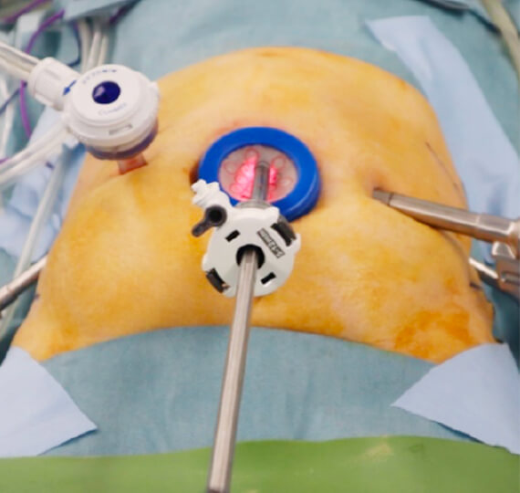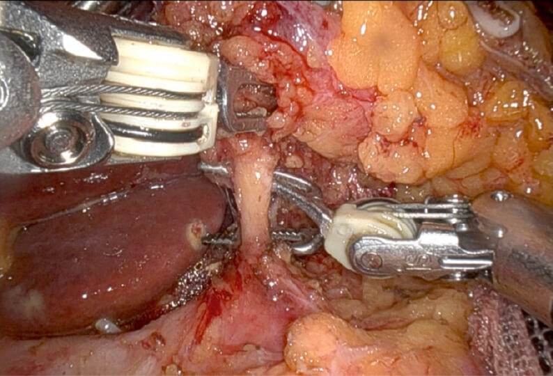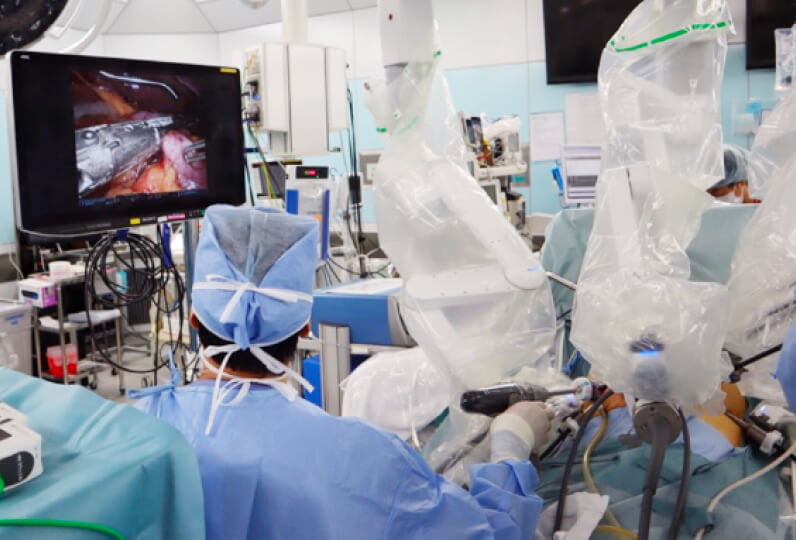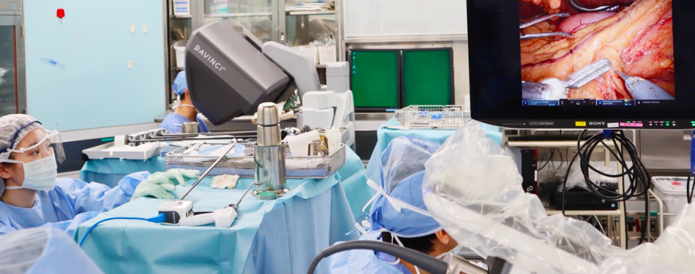 教室における胃がんの治療方針は基本的には「胃癌治療ガイドライン」に従って決定しています。特に早い段階の胃がんの患者さんに対しては体に負担の少ない手術として腹腔鏡下(ふくくうきょうか)手術を1999年より取り入れ、手技の安定化に伴って進行胃がんに対しても適応を拡大して積極的に行い、2010年には腹腔鏡手術の件数が開腹手術を超えました。現在では全体の90%近くを腹腔鏡手術で行っており、通常の開腹手術と比べても同等の治療成績が得られ教室における標準的治療になっています。また、2018年より保険適応となったロボット支援下手術も2019年より導入し開始しました。今後さらなる精度の高い低侵襲手術として症例数が増加するものと考えています。